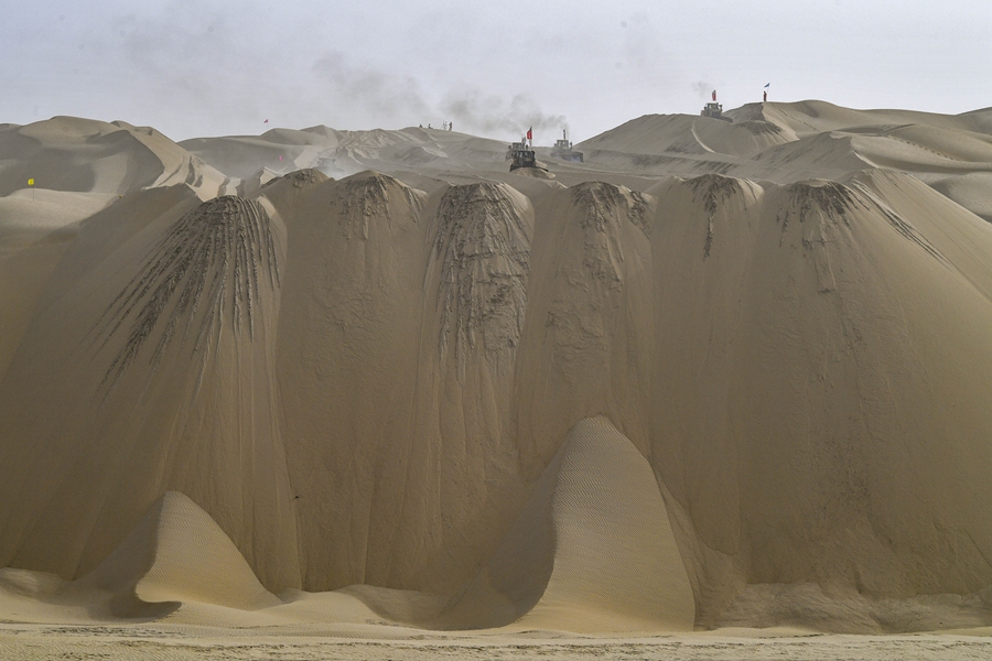 Large bulldozers are lined up to level the sand hills.[Photo/Xinhua]