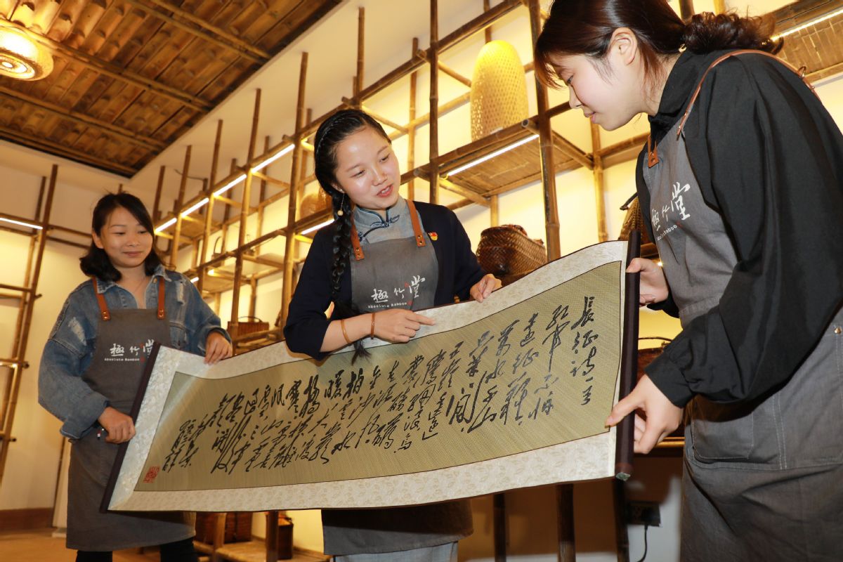 Yang Changqin, middle, shows a bamboo-weaving painting at her workshop in Chishui, Southwest China's Guizhou province, in May 2020. [Photo by Wang Hong/provided to chinadaily.com.cn] |