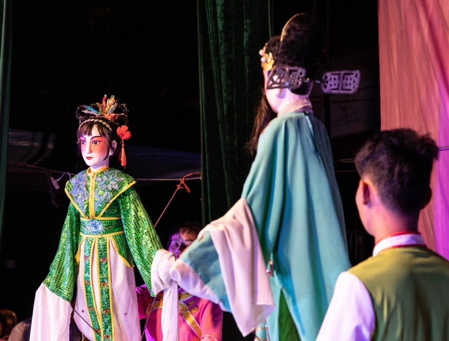 Artists perform man-and-puppet show at Meilang Village in Lin'gao county, South China's Hainan province on May 24, 2020. The man-and-puppet show, a local art originating in Southern Song Dynasty (1127-1279), was listed as a national intangible cultural heritage. Accompanied by traditional instruments, puppeteers and lifelike puppets perform on stage together.[Photo/Xinhua]