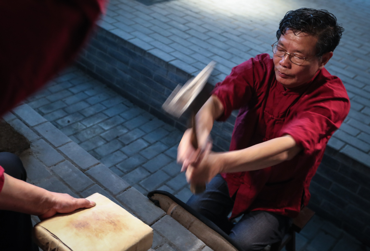 Wang Bisheng hammers out gold leaf at a workshop of Nanjing Nanjing Gold Thread and Gold Leaf Factory in Jiangsu province, July 14, 2020. [Photo/Xinhua]