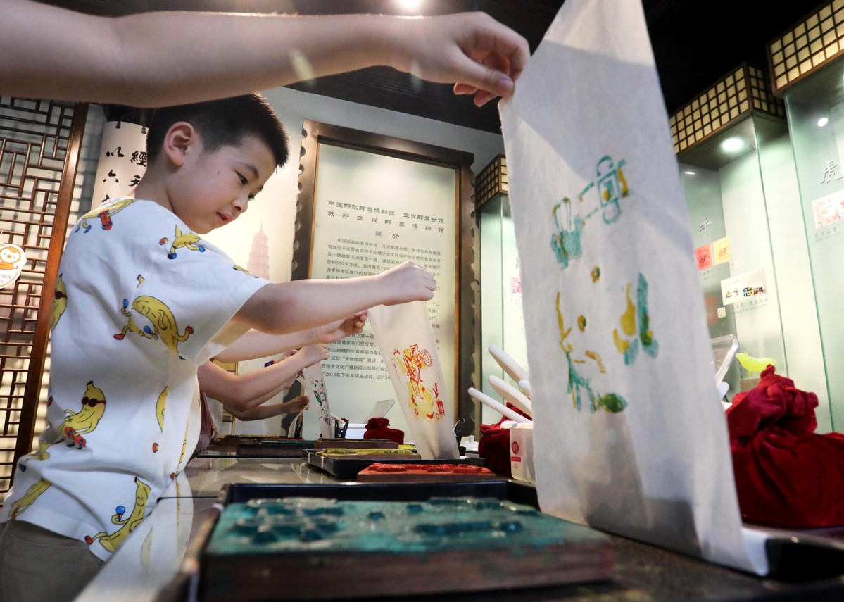A child looks at his creation of a wood-print nianhua, a traditional type of painting decorated to celebrate the Spring Festival, at the Suzhou Shengxiao Stamp Museum of China in Suzhou, East China's Jiangsu province, on July 18. [Photo/Xinhua]
