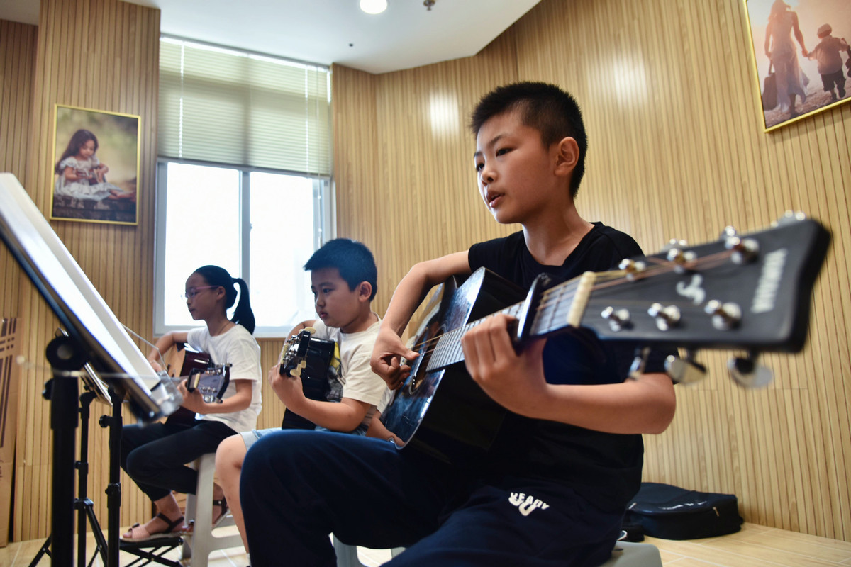 Children practice the guitar during a lesson in Nantong, East China's Jiangsu province, on July 18. [Photo/Xinhua]