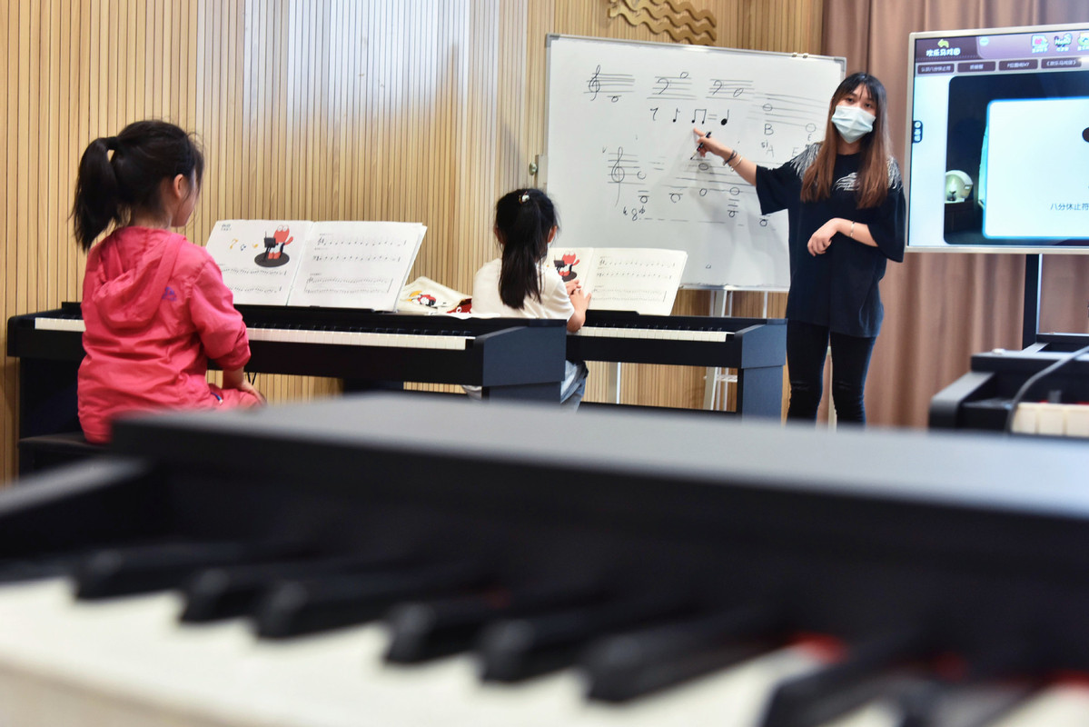 Two girls listen as a teacher explains music theory during a piano lesson in Nantong, East China's Jiangsu province, on July 18. [Photo/Xinhua]