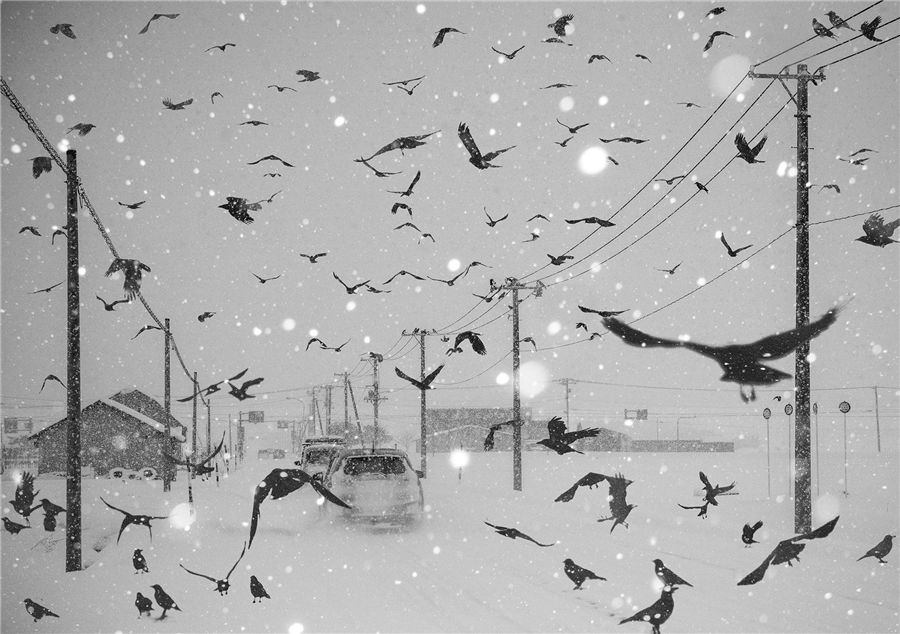 Crows fly in the snow in Hokkaido. [Photo by Hu Guoqing/cpanet.org.cn] |