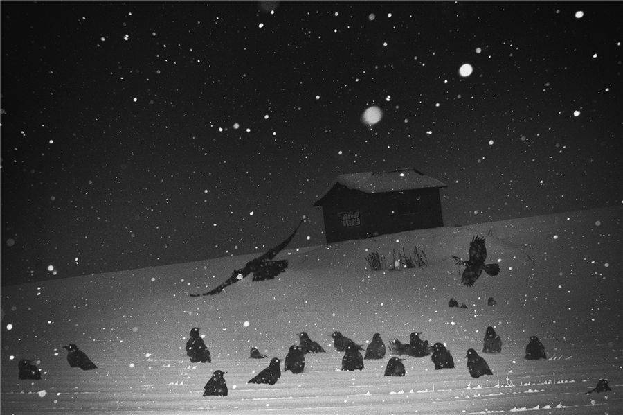 Crows fly and nestle in the snow in Hokkaido. [Photo by Hu Guoqing/cpanet.org.cn]