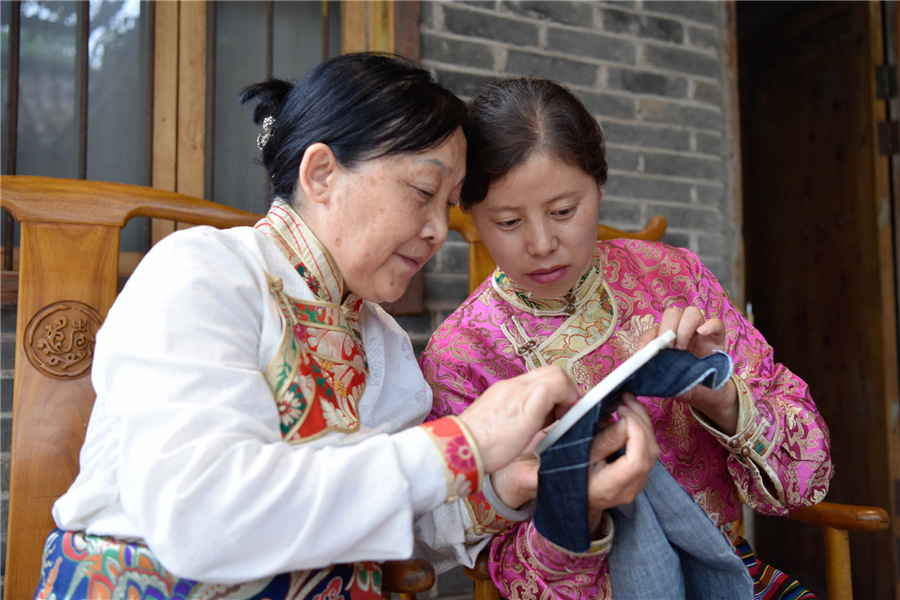 Yang demonstrates embroidery techniques for a trainee at the Huazhen Tibetan-Qiang Cultural Museum in Chengdu, Southwest China's Sichuan province. [Photo/Xinhua]