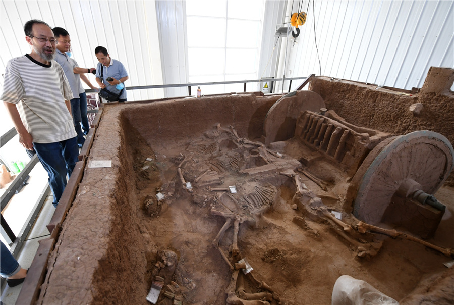 A carriage relic dating back to the Western Zhou Dynasty (c.11th century-771 BC) is restored by archeologists in Xi'an, Northwest China's Shaanxi province, on July 30, 2020. [Photo/Xinhua]