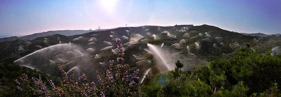 This undated photo shows the spray irrigation system at Yuquan Mountain Forest Park. [Photo provided to chinadaily.com.cn] |