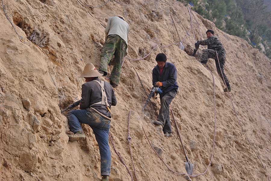 In this undated photo, workers in Zhang’s team dig pits with electric picks. [Photo provided to chinadaily.com.cn] |
