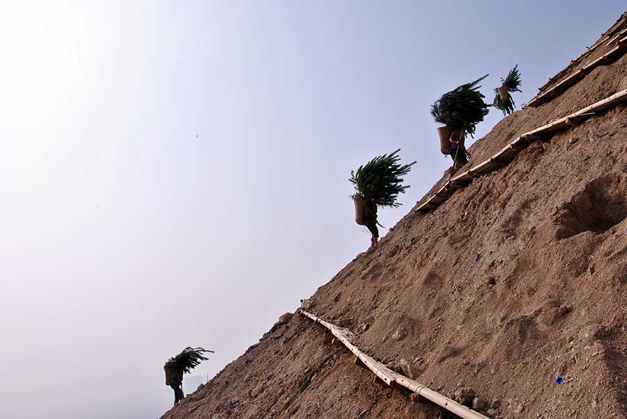 In this undated photo, workers in Zhang’s team walk on a wooden plank road carrying saplings. [Photo provided to chinadaily.com.cn] |
