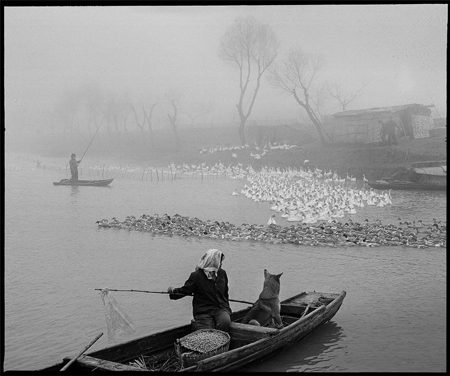 The photo taken in 1981 shows a farmer herding ducks on a boat. [Photo by Tang Desheng/cpanet.org.cn]
