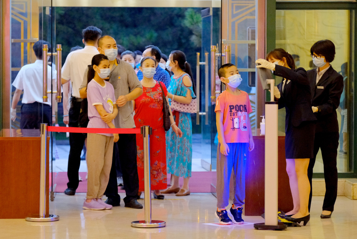 Viewers line up to have their temperatures taken at the Forbidden City Concert Hall. [Photo provided to China Daily]