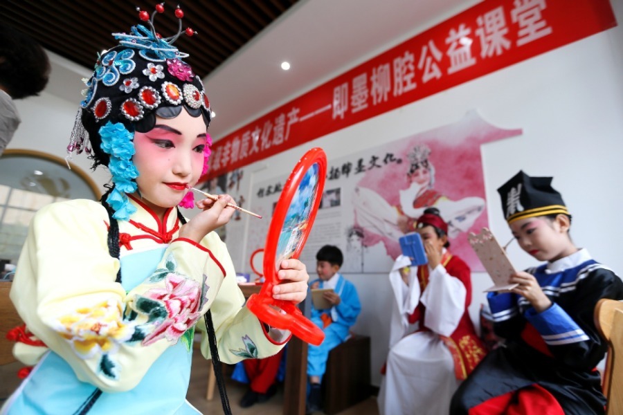 Primary students learn to apply make up in a public welfare class in the Gucheng community in Qingdao, East China's Shandong province, on Aug 18, 2020.[Photo/Xinhua]