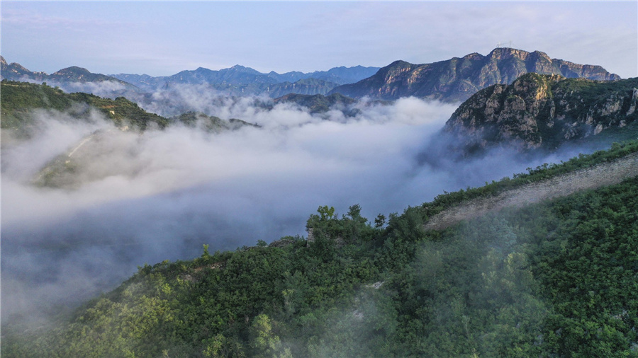 An aerial view of the Great Wall in Zunhua, North China's Hebei province, on Aug 21, 2020. [Photo/Xinhua]