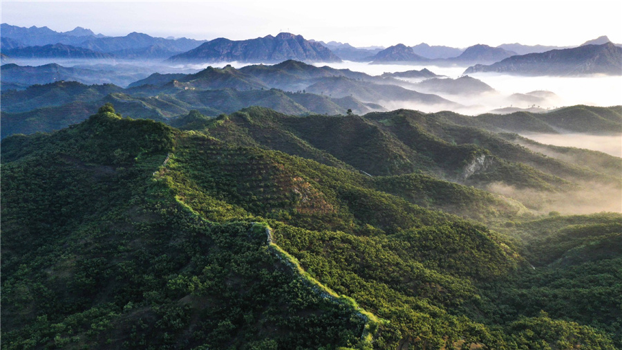 An aerial view of the Great Wall in Zunhua, North China's Hebei province, on Aug 21, 2020. [Photo/Xinhua]