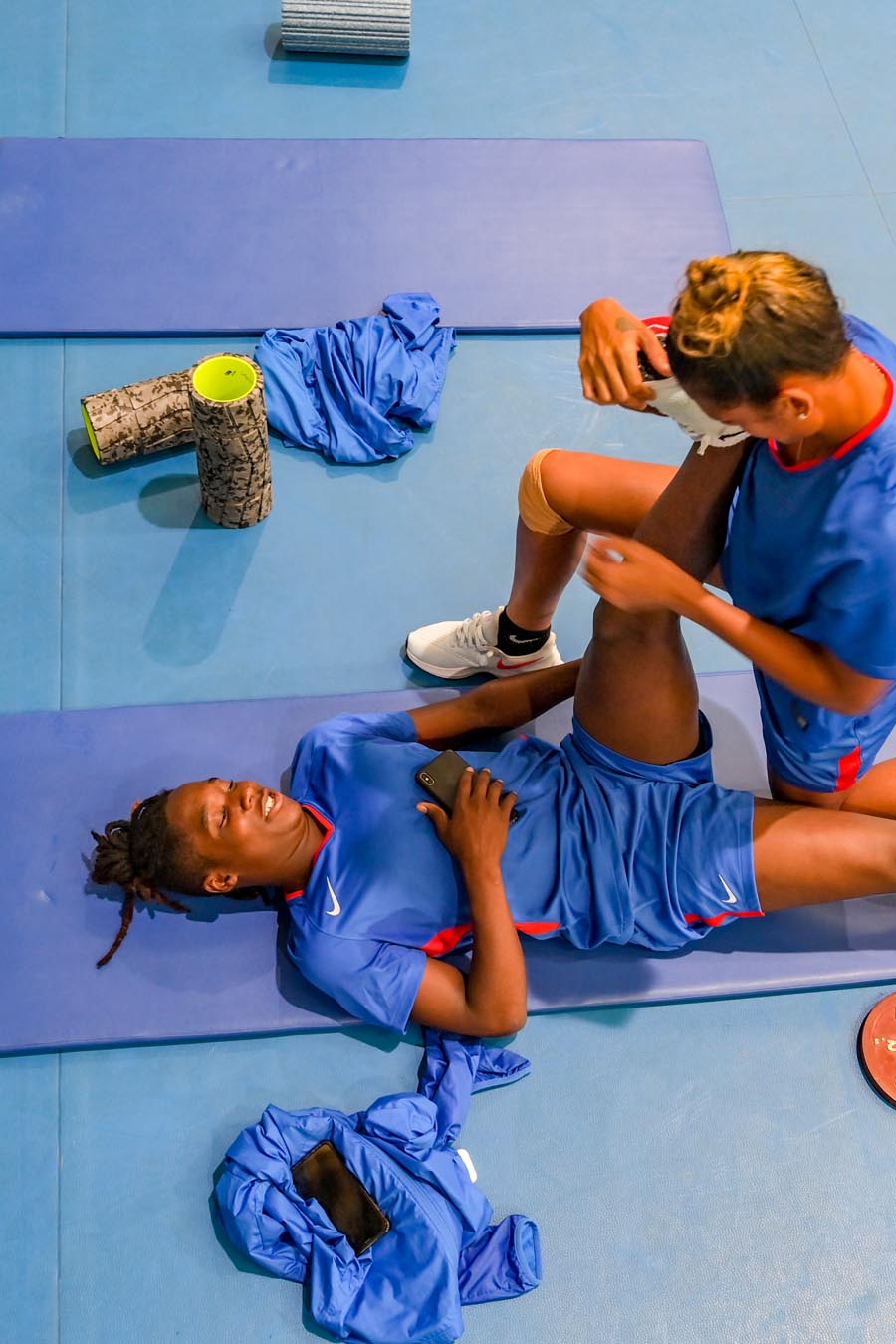 A teammate helps Barbara Banda relax her muscle, Aug 30. [Photo/Xinhua] |