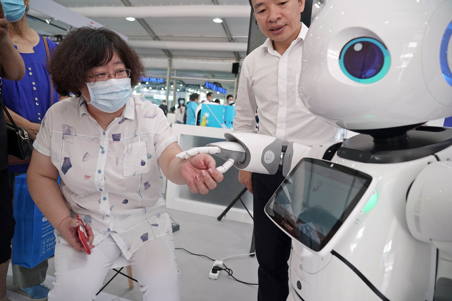 An AI robot is used to take people's pulse at the?ongoing 2020 China International Fair for Trade in Services, Sept 7, 2020.[Photo/Xinhua] |