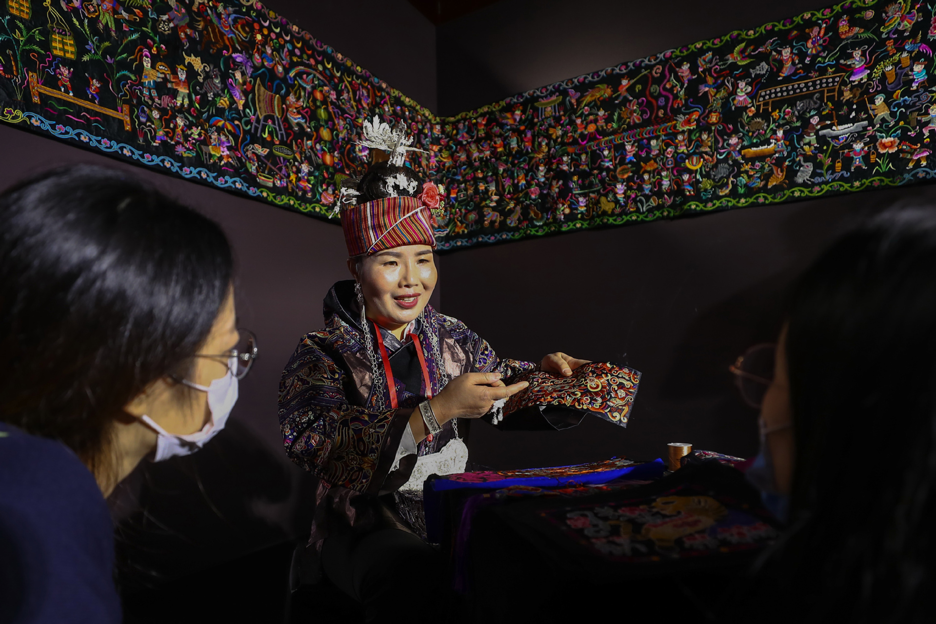 An embroider interacts with visitors at the 2020 China International Fair for Trade in Services, Sept 7, 2020. The four embroiders from the Miao ethnic group are participants of a non-profit project called "Made by Moms", which enables low-income women to make money through producing handicrafts that feature China's intangible cultural heritage. 49 workshops have been established since the initial launch of the program, with over 4,000 women being employed, which is a big improvement to their lives and at the same time can help with many social problems related to "empty-nest" seniors and "left-behind" children. [Photo/Xinhua]