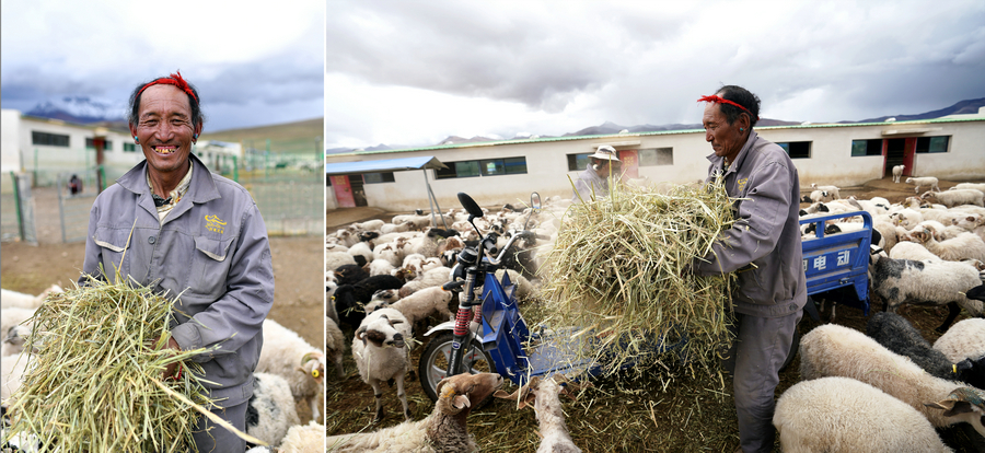 Tonzhub (left) in Bangbug village of Tingri county, Shigatse, Tibet autonomous region; Tonzhub feeds livestock at the animal husbandry in Bangbug. He earns 3,500 yuan ($516.62) monthly tending to his sheep, which also earn him dividends at the end of the year. Photograph clicked on July 31.[Photo/Xinhua]