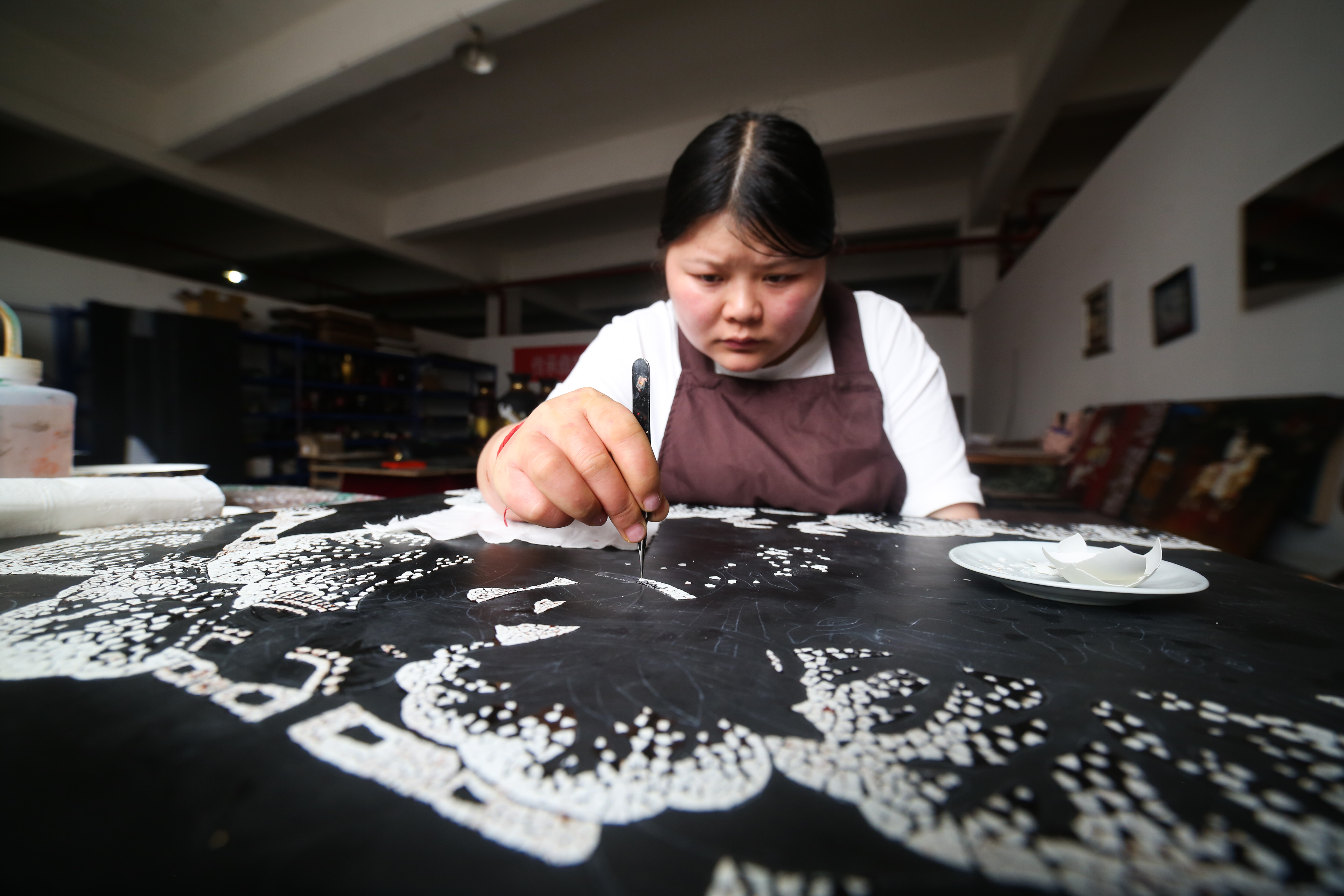 A trainee at the factory uses a precision tool to place tiny pieces of eggshell into the lacquerware.[Photo by Luo Dafu/For China Daily]
