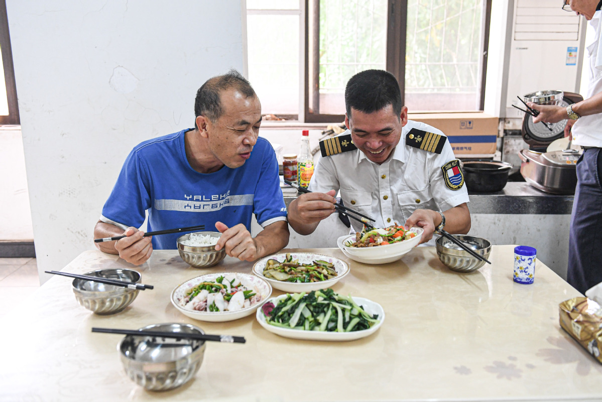Lin Hongpin (right) returns to the station in Yangpu and chats with Lin Daoming during lunch. [Photo by Pu Xiaoxu/Xinhua]