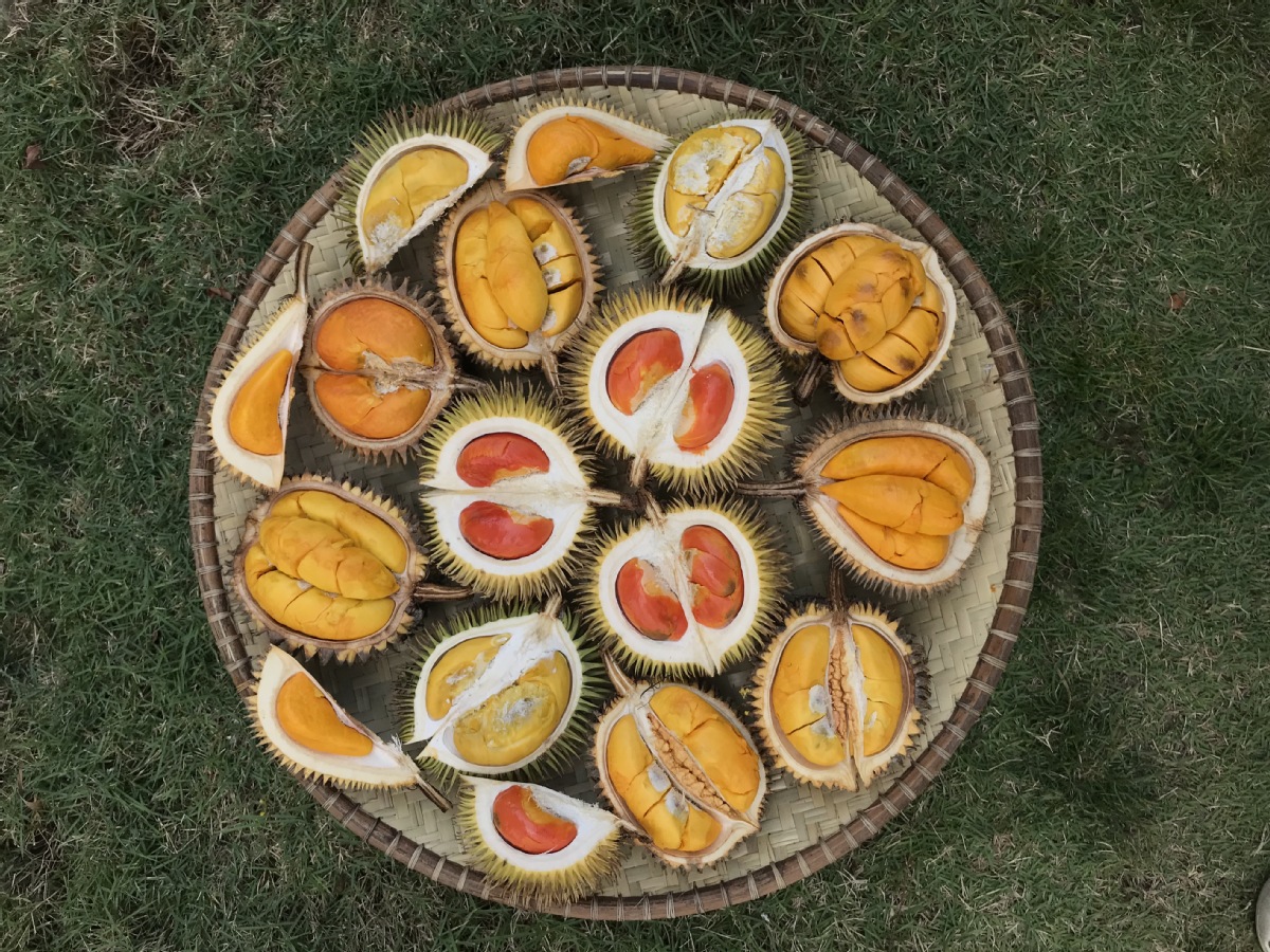 A display of various kinds of durians, including the red-fleshed wild Sukang variety, obtained by Yang Xiaoyang in Limbang, Malaysia, in 2019.[Photo provided to China Daily] |