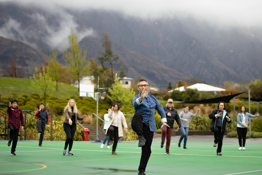 About 20 people demonstrate tai chi on the street in Queenstown, New Zealand on Oct 7, 2020. [Photo provided to Chinaculture.org]