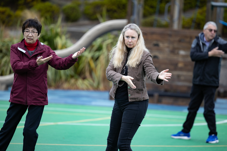 About 20 people demonstrate tai chi on the street in Queenstown, New Zealand on Oct 7, 2020. [Photo provided to Chinaculture.org]
