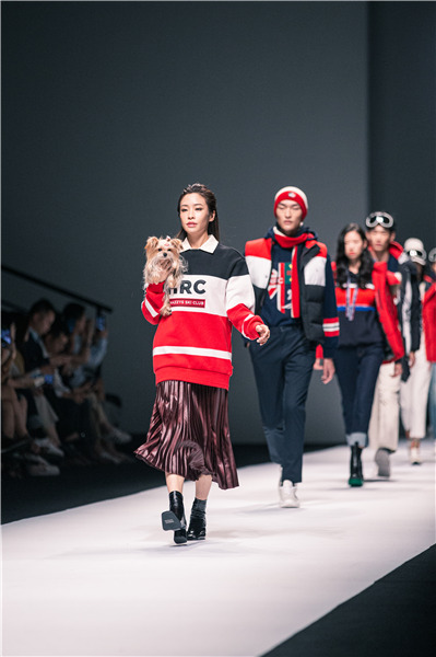 Models present the latest HAZZYS collection with therapy dogs at Shanghai Fashion Week on Oct 13. [Photo provided to chinadaily.com.cn]