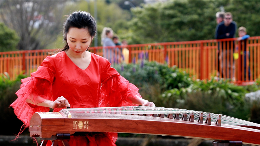 Students from the guzheng class held by the China Cultural Center in Wellington perform a traditional Chinese tune Jasmine Flower at the Avalon Park in Wellington. [Photo provided to Chinaculture.org] |