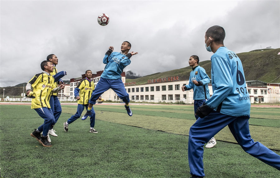 A soccer match is underway at a local middle school in Baqing county, Tibet autonomous region, Aug 1, 2020. [Photo by Liu Yingyi/cpanet.org.cn]