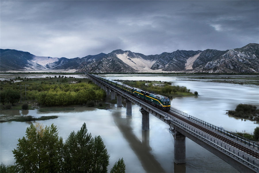 A train passes on Lhasa River Bridge in Tibet autonomous region, Aug 19, 2014. [Photo by Yuan Ruilun/cpanet.org.cn]