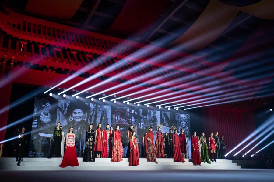 Models present creations from Eve Group during a show featuring Lijin and Miao embroidery in Beijing on Friday as part of the 2020 China Fashion Week. [Photo provided to chinadaily.com.cn]