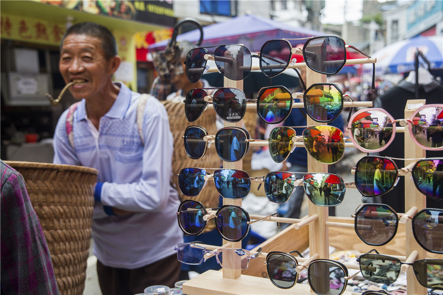A street vendor sells a wide variety of sunglasses at the local fair in Sinan county, Guizhou province. [Photo by Kang Taisen/For China Daily]