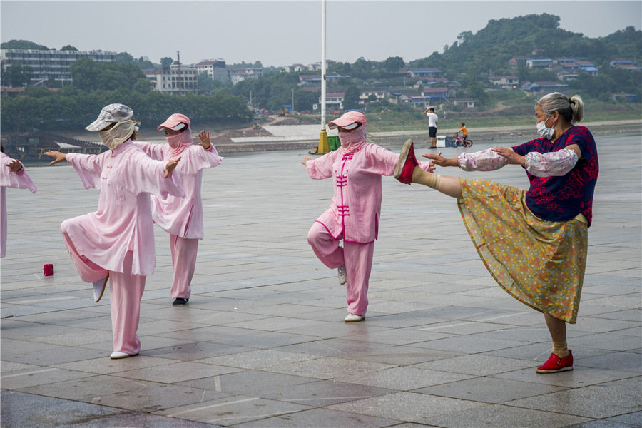 An old lady passing by watches a group practicing tai chi and cannot help but follow along in Yuanling county, Hunan province. [Photo by Kang Taisen/For China Daily]
