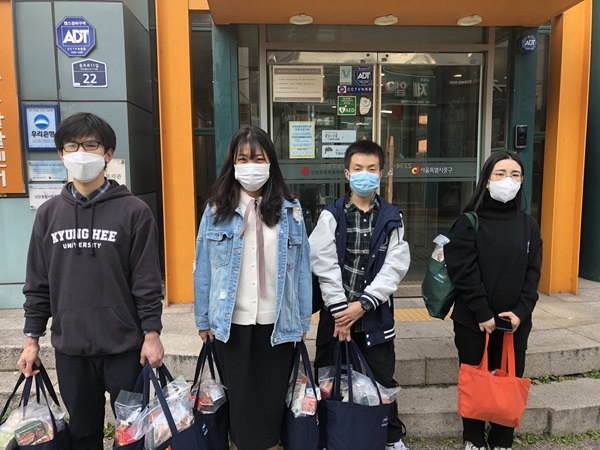 Li Hao (first from left) and other international students deliver food to the elderly people in Seoul.[Photo provided to China Daily]