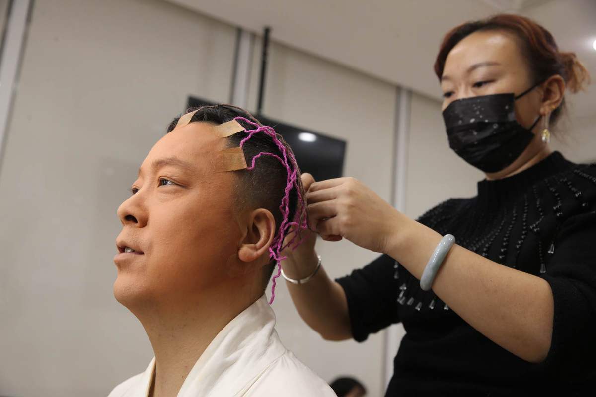 A makeup artist prepares Qu Peng, a skilled Qinqiang Opera performer, for the stage. [Photo by Huo Yan/China Daily] |