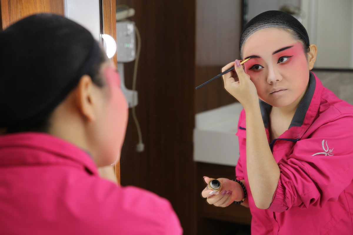 A performer puts on makeup. [Photo by Huo Yan/China Daily] |