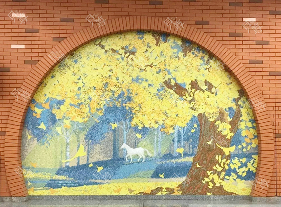 This undated photo shows a mosaic featuring white deer frolicking under ginkgo trees, which can be seen at the Xihuangcun station on Beijing Subway’s Line Six. [Photo/Courtesy of Bizen Art & Culture Media Co., Ltd.] |