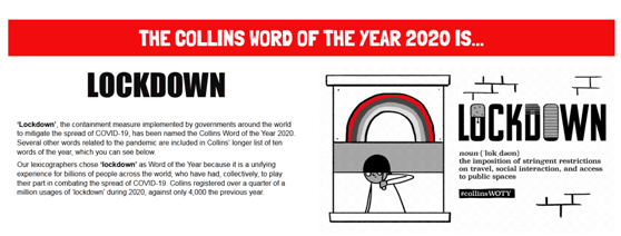 "Lockdown" was chosen as Collins Dictionary's word of the year for 2020 due to the dramatic increase in usage during the COVID-19 pandemic.