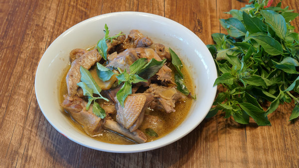 6. When time is up, add the Shaoxing wine, Taiwan basil and scallion. Stir well. Put the lid back and braise for another 10 mins. Turn off heat and salt to taste. Enjoy!
