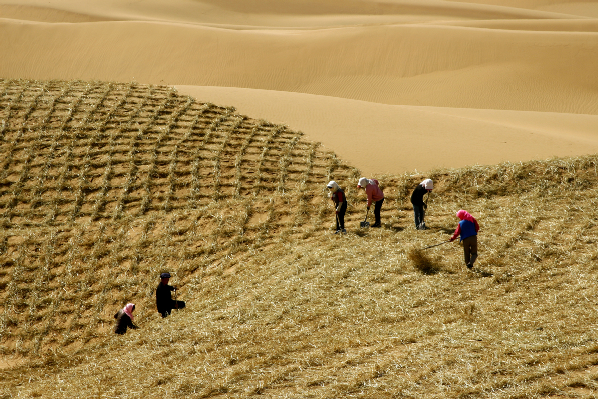 People in Zhongwei, Ningxia Hui autonomous region, use wheat straw to pave checkerboard sand barriers that stabilize the encroaching desert. [Photo provided to China Daily] |