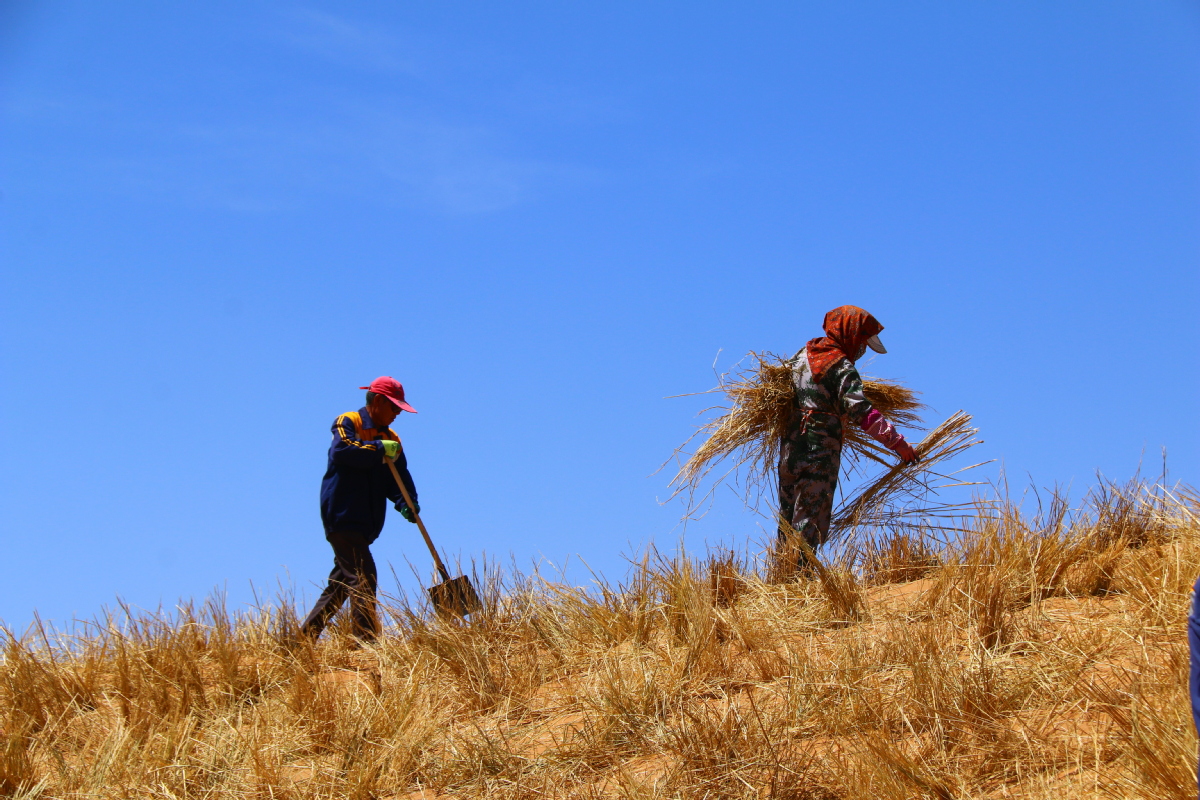 People in Zhongwei, Ningxia Hui autonomous region, use wheat straw to pave checkerboard sand barriers that stabilize the encroaching desert. [Photo provided to China Daily] |