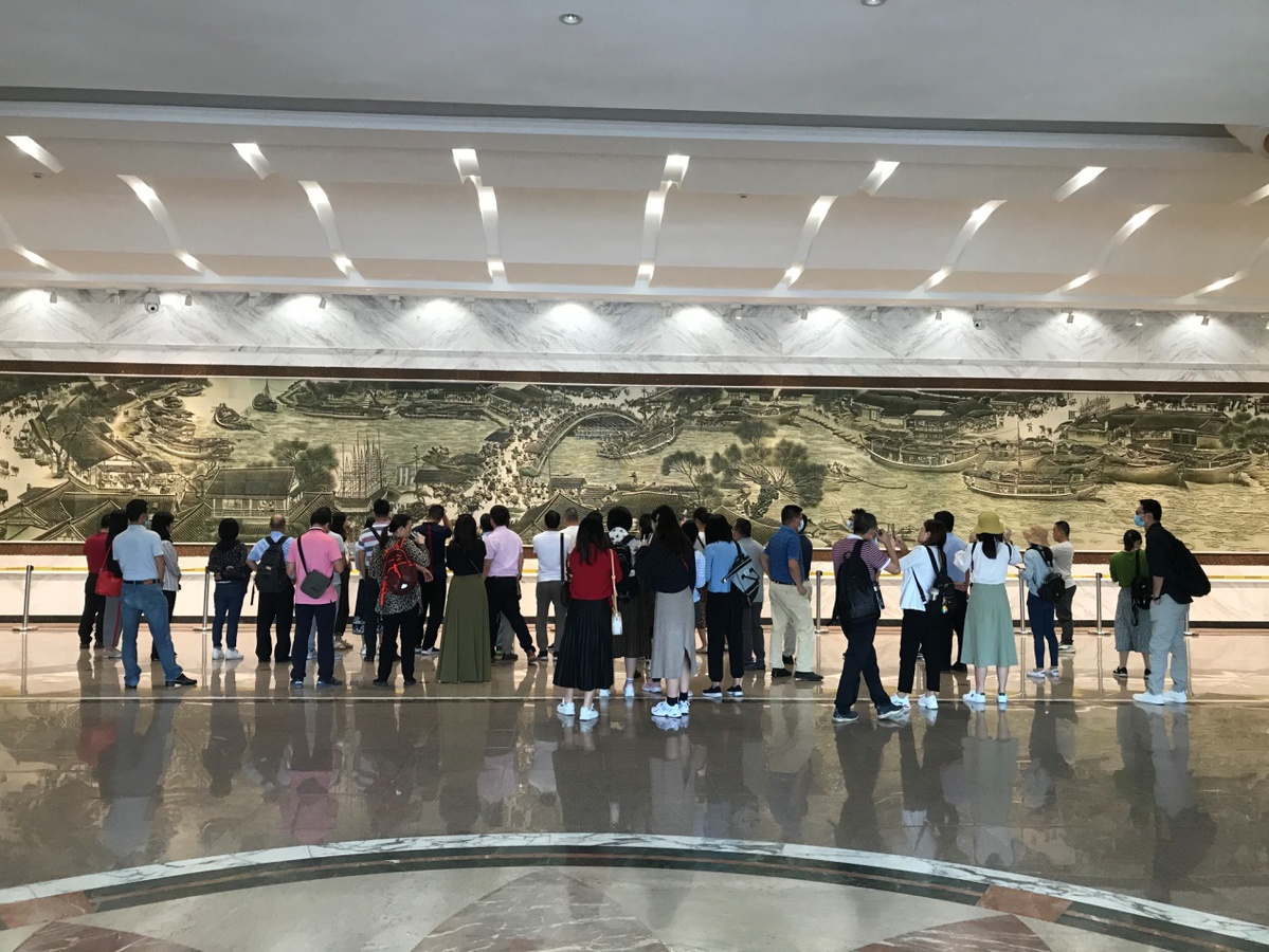 A 62-meter-long porcelain work emulating Riverside Scene During the Qingming Festival, a masterpiece painting by Zhang Zeduan of the Northern Song Dynasty (960-1127), is viewed by visitors. [Provided to chinadaily.com.cn]