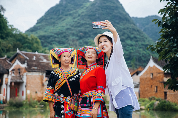 Lou Yixiao takes a selfie with residents of Goulanyao village in Jiangyong county, Hunan province. [Photo provided to China Daily] |