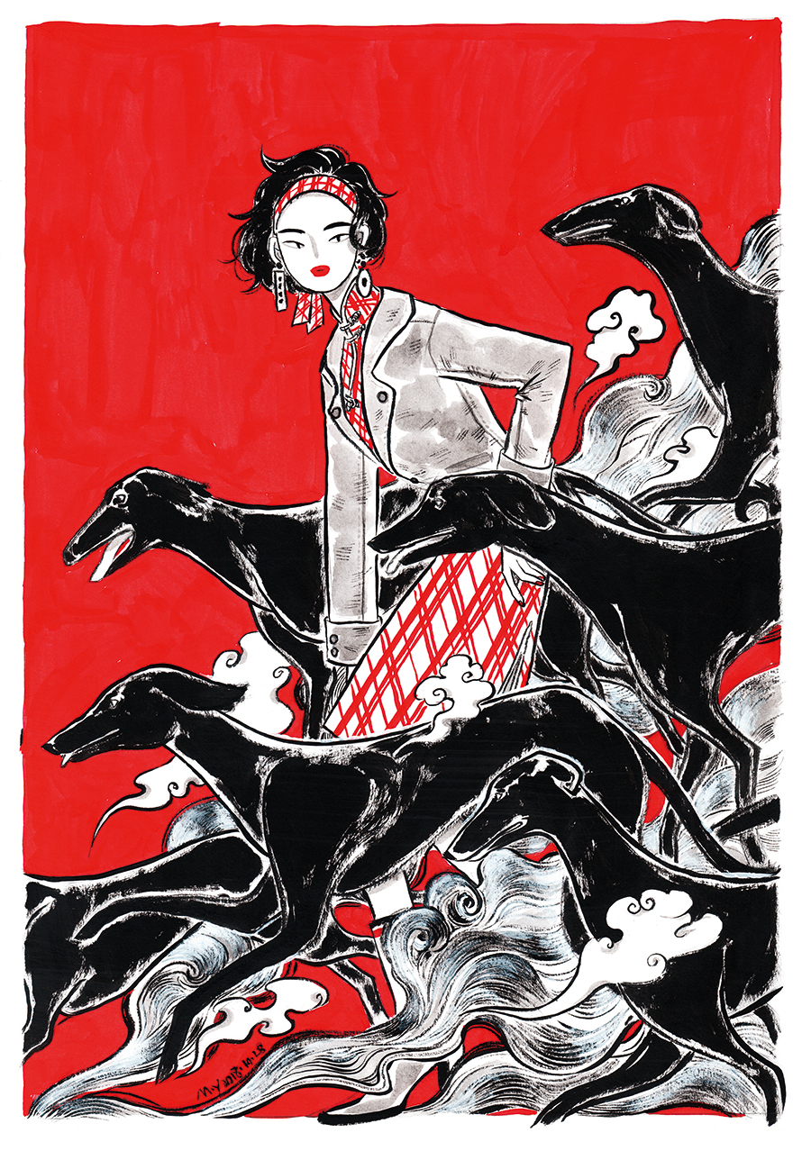 There was nothing subtle about the art on display. This was not a vase of flowers in a sunlit room, nor green fields with butterflies, but a dragon with flames, a Peking-Opera-costumed performer, a woman in the style of the Qing Dynasty (1644-1911) carrying pigment and a paint brush, and a modern girl with a Western suit floating in the air with clouds and black dogs galloping by her side...