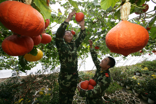 Soldiers assigned to a logistics department at an armed police base in Lhasa harvest pumpkins in 2006. The base planted 21 varieties of vegetables in the city. [Photo by Zhao Yanzhi/China Daily] |