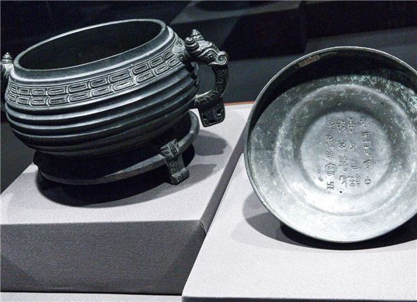 A bronze gui food receptacle and lid of the Zhou Dynasty (c.11th century-256 BC) from Rong Geng's former collection on show at the National Art Museum of China. [Photo by Jiang Dong/China Daily] |