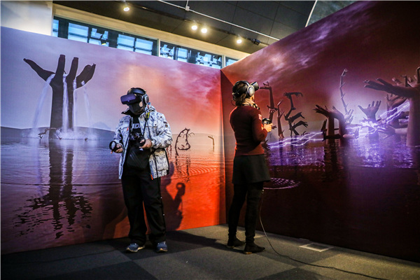 Visitors donning headsets create countless hands in a virtual world. Using the hands, they can explore their superpowers, such as climbing high into the sky or diving into deep water.?[Photo provided to China Daily] |