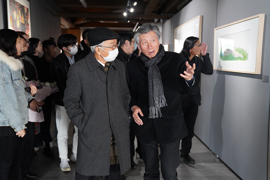 Oil painter Jin Shangyi (left) and Fan Di'an dean of Central Academy of Fine Arts at the exhibition. [Photo provided to China Daily] |